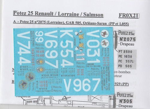 cette planche A7 vous permet de réaliser (avec la maquette FR0037 Potez 25 A2/B2 Lorraine) un des Potez 25 suisses, le n°855 (moteur Hispano capoté Lorraine). Les Potez 25 suisses ont été équipés de skis, mais il faudra transformer ceux fournis dans la boîte, car leur forme était différente, si vous voulez reproduire cette configuration. Voir l’historique des Potez 25 suisses.